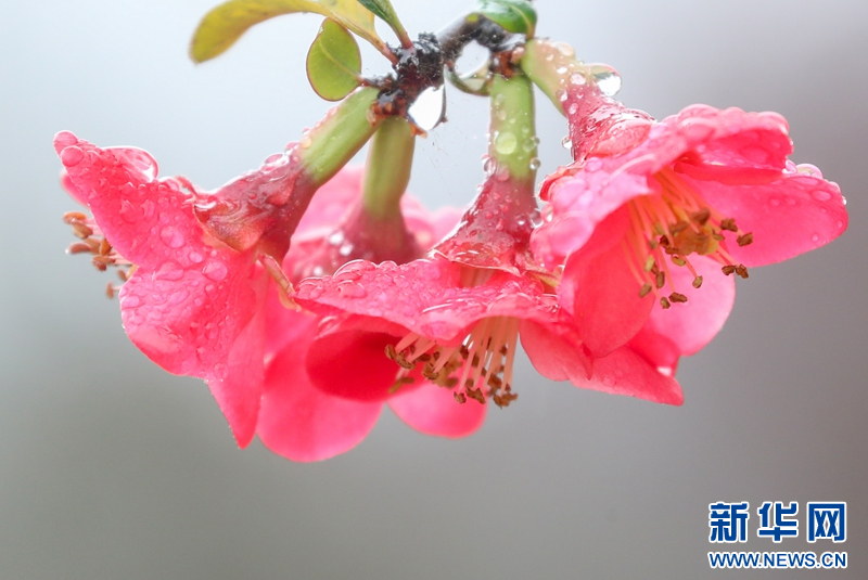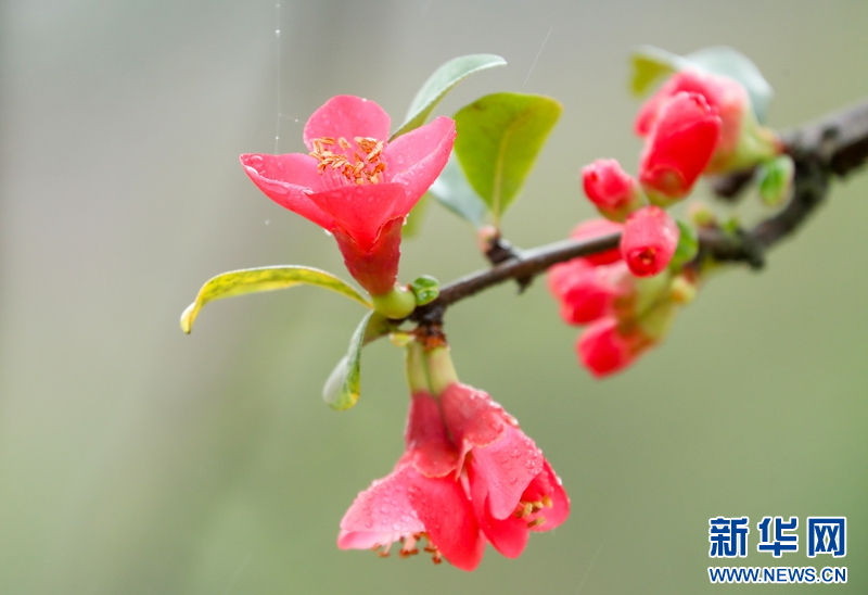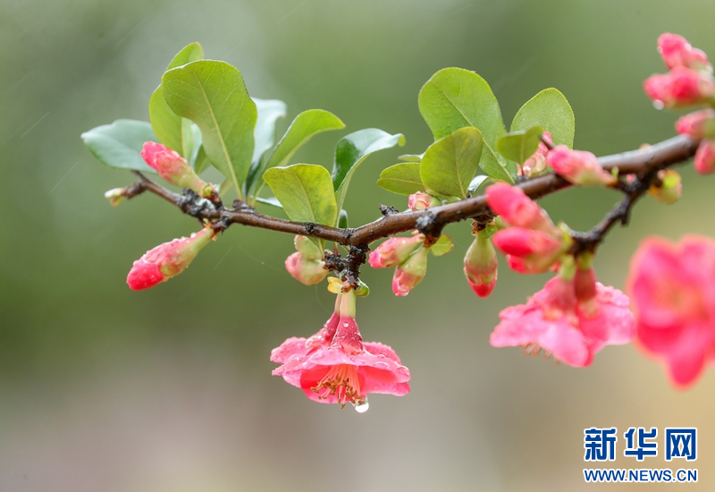 一场春雨之后,四川省华蓥市城北公园相继绽放的海棠花在绵绵春雨滋润下娇艳欲滴,让人想起宋代诗人陈与义笔下描绘的“海棠不惜胭脂色,独立蒙蒙细雨中”。