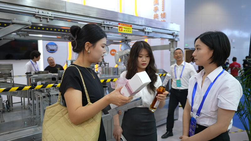 商投酒品吸引了大量市民、游客以及外国友人驻足欣赏与选购。展厅首次展出了德阳商投集团智能酿造设备模型,该设备能够精确监测和调控关键参数,提升产品的一致性、品质稳定性和生产效率。