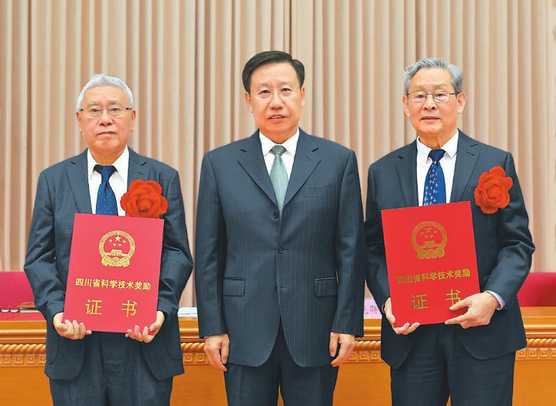 会上,宣读了《四川省人民政府关于2023年度四川省科学技术奖励的决定》。在热烈掌声中,王晓晖首先为省科学技术杰出贡献奖获得者杜祥琬、李安民颁发证书。随后,王晓晖、施小琳、田向利等省领导为省杰出青年科学技术创新奖、自然科学奖、技术发明奖、科学技术进步奖的获奖代表颁发证书。获奖代表杜祥琬和成都市、绵阳科技城、国家高端航空装备技术创新中心、四川华鲲振宇智能科技公司负责同志作了交流发言。