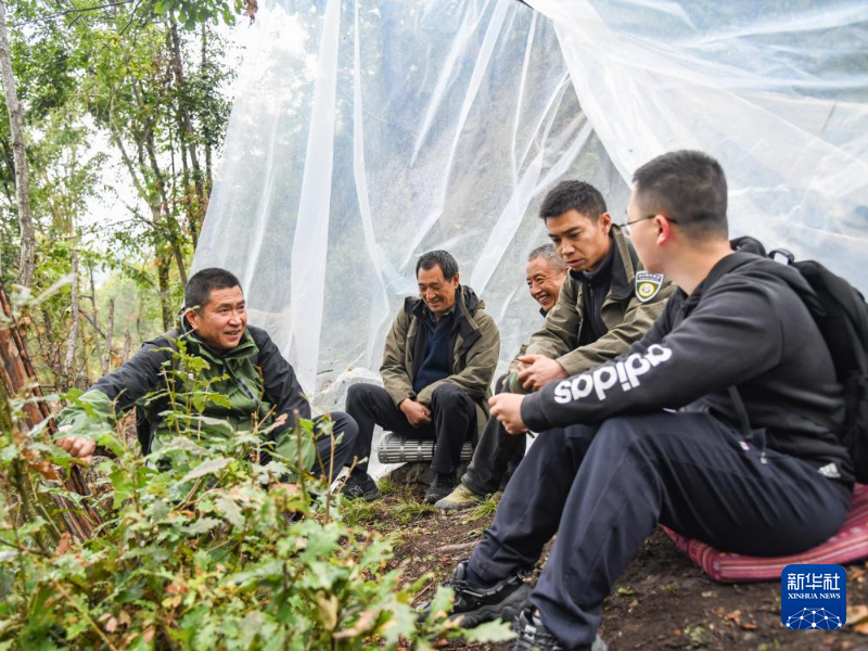 在四川白河国家级自然保护区,唐玉林(左一)和巡护队员一起在搭建的简易塑料蓬内短暂休息交流(10月11日摄)。新华社记者 王曦 摄