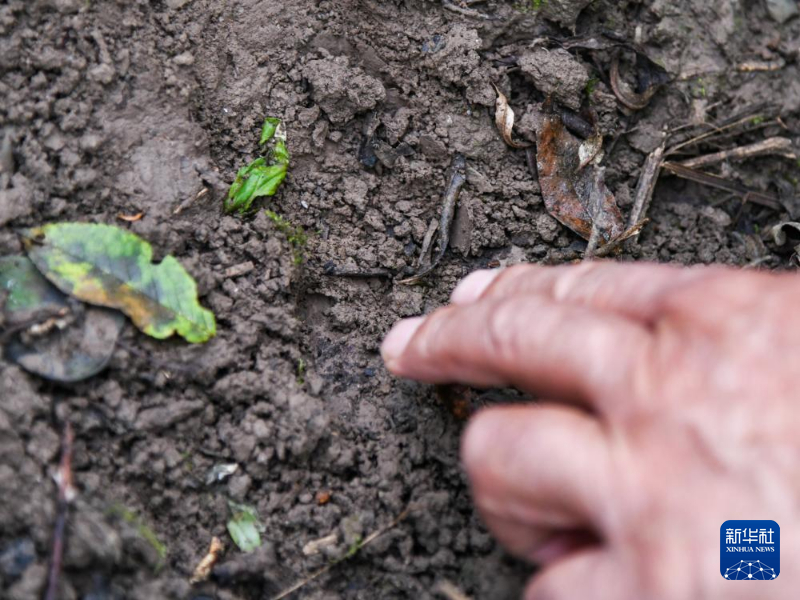 在四川白河国家级自然保护区,唐玉林在巡护路上发现毛冠鹿的脚印(10月11日摄)。新华社记者 王曦 摄