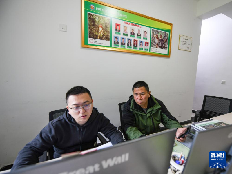 在四川白河国家级自然保护区,唐玉林和西华师范大学生物学研究生刘昕在办公室将巡护记录的资料录入电脑系统(10月11日摄)。新华社记者 王曦 摄
