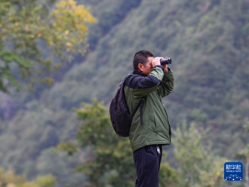 在四川白河国家级自然保护区,唐玉林在观察川金丝猴活动(10月11日摄)。新华社记者 王曦 摄