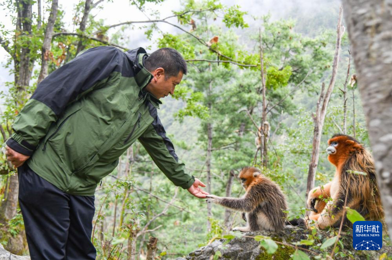在四川白河国家级自然保护区,唐玉林和川金丝猴互动(10月11日摄)。新华社记者 王曦 摄