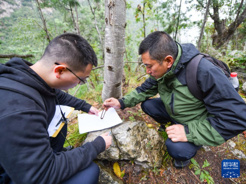 在四川白河国家级自然保护区,唐玉林(右)和西华师范大学生物学研究生刘昕在收集记录川金丝猴的粪便(10月11日摄)。新华社记者 王曦 摄