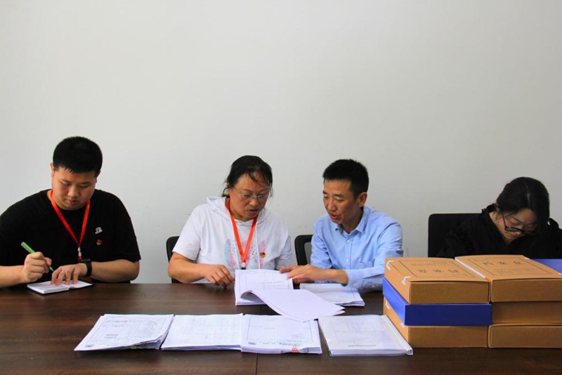 四川省雅安市宝兴县纪检监察干部(左一和左二)在当地一在建项目的项目部查看农民工工资兑付情况。(徐豪翰 摄)