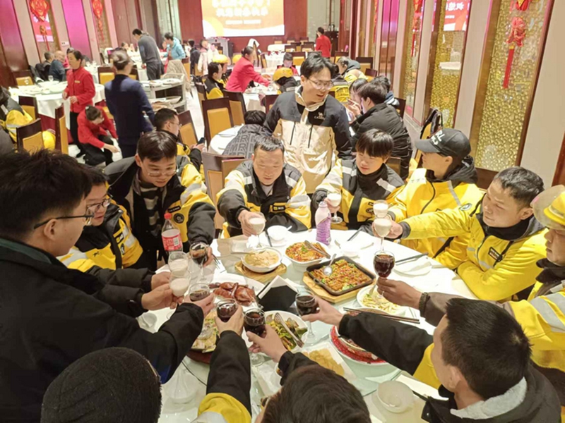 在成都城南,美团成都大源片区站点坚守岗位的50多名外卖骑手们欢聚一堂。“我们肩并肩为这座城市服务,大家辛苦一年了,祝大家新春快乐,出入平安!”副站长杨春林是四川巴中人,他没有返乡,和许多外省骑手一起坚守岗位。订单一直繁忙,他们忙到系统切换之后才相继来到酒店,酒店特地给他们留了桌,等到客人来齐才上热菜。