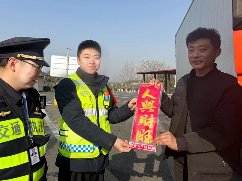 上海司机钟师傅(右一)收到了春节礼物。四川成德南高速公路金堂服务区供图