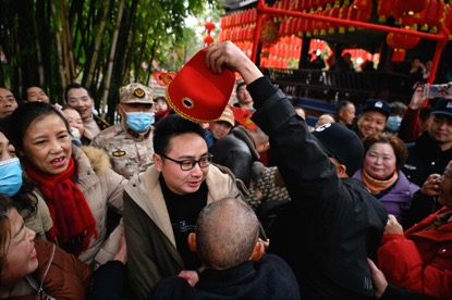 2月13日,四川省德阳广汉市房湖公园举行“拉保保”民俗活动。