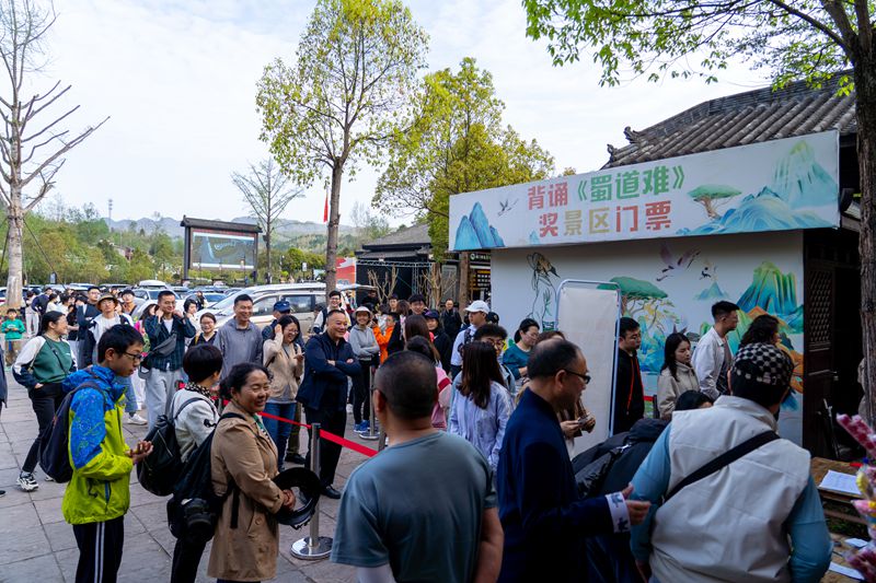 今年清明假期,剑门关景区“背诵《蜀道难》奖景区门票”活动现场。(广元市剑阁县委宣传部供图)
