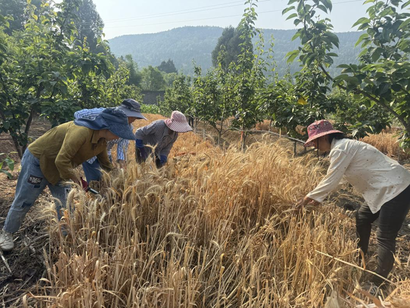 村民们在粮经复合种植基地收割小麦。(苍溪县委宣传部 供图)