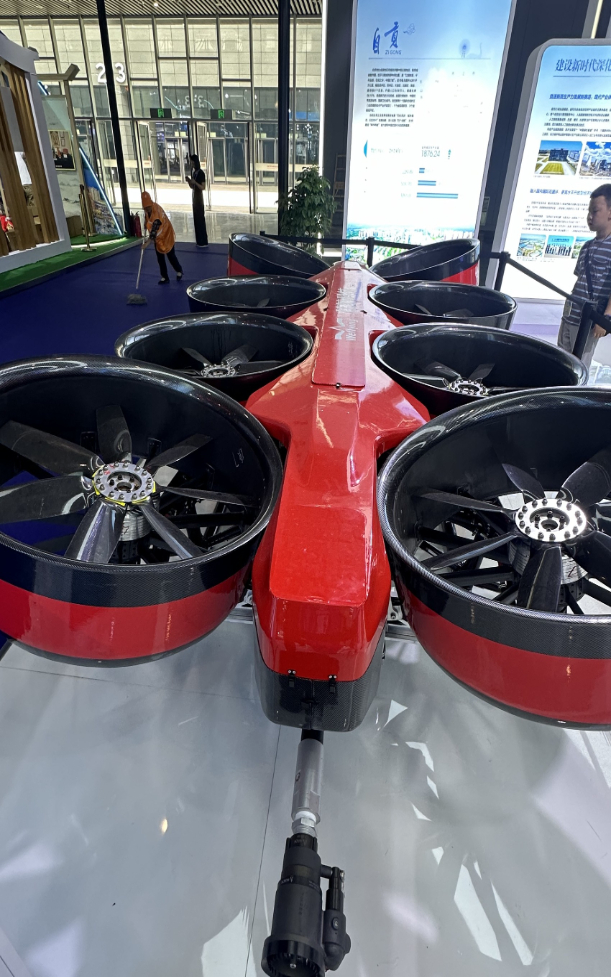 馆内,一架有着8个大风扇、造型“酷炫”的无人机吸引了记者的目光。