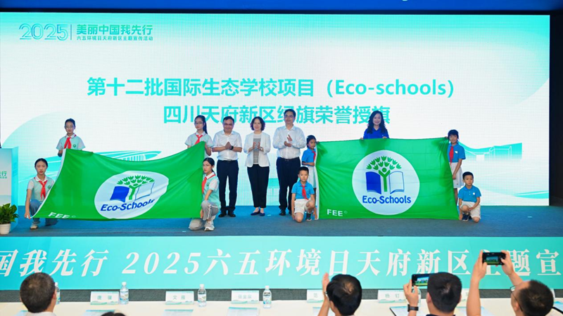作为天府新区生态教育的重要实践地,天府七小、永兴小学于2025年上榜“第十二批国际生态学校项目(Eco-schools)绿旗荣誉”名单,活动现场为两所“绿旗”学校授旗,鼓励更多学校持续推进校园低碳实践。