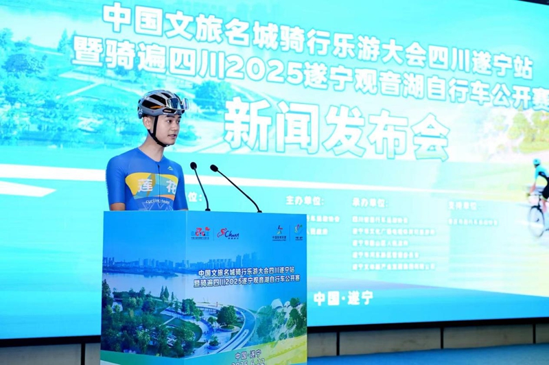 发布会上,参赛运动员代表邓志秋向大家分享了遂宁骑行体验,他表示:圣莲岛段的湖光山色令人惊艳,骑行时能感受到遂宁对生态与城市建设的巧妙平衡,赛道设计中的缓坡与弯道兼具挑战性与观赏性,既适合专业选手竞速,也能让业余爱好者享受骑行乐趣。此外,他还前往了千年古刹广德寺和闻名遐迩的中国死海游玩,品尝了独具特色的遂州砂锅、涪江鱼、美宁肥牛以及遂宁“冲”、窝子凉粉、豆腐皮、观音素麻花等经典小吃,这段跟着赛事游遂宁的时光让他感到十分惊艳。