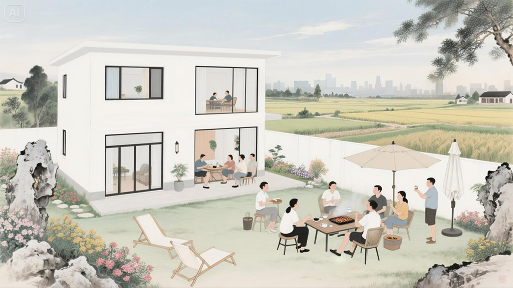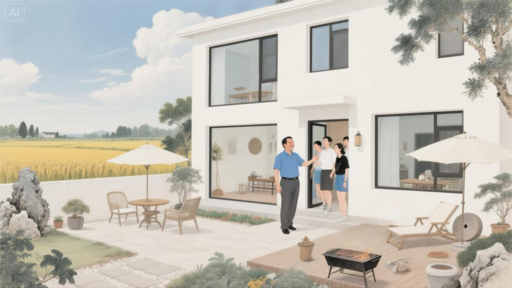 丁黎均心里的“土灶红”VS女儿笔下的“极简白”,最终方案:磨盘嵌进水泥地,露台接住整片星空和稻浪。