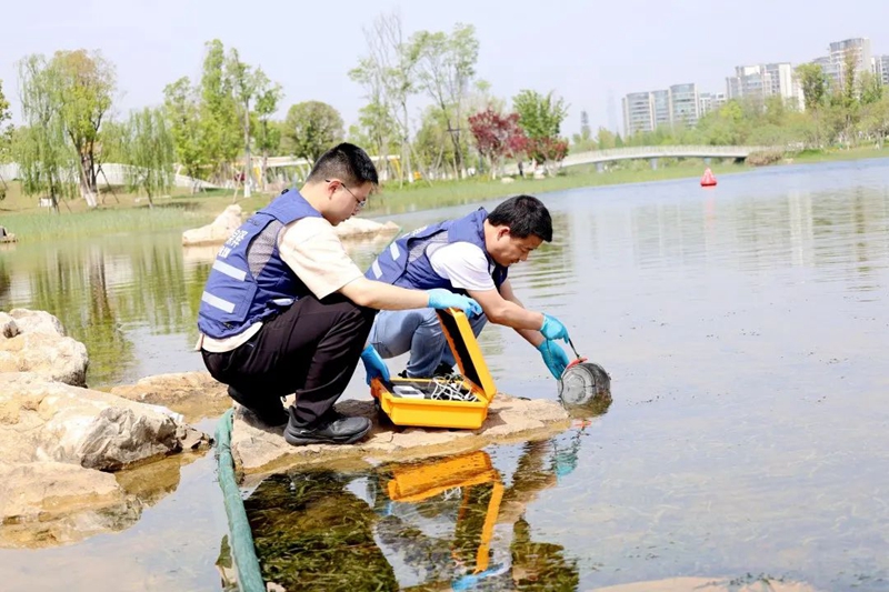 采集重点水域水样并检测。(四川省生态环境厅 供图)