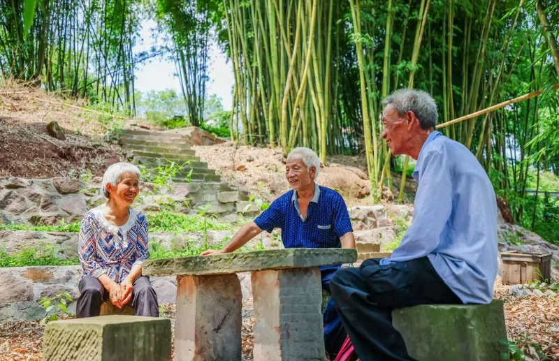 8月初,走进四川省自贡市沿滩区永安镇刘山村,阳光透过郁郁葱葱的竹林,洒下点点碎金,映照着几张古朴的石凳。