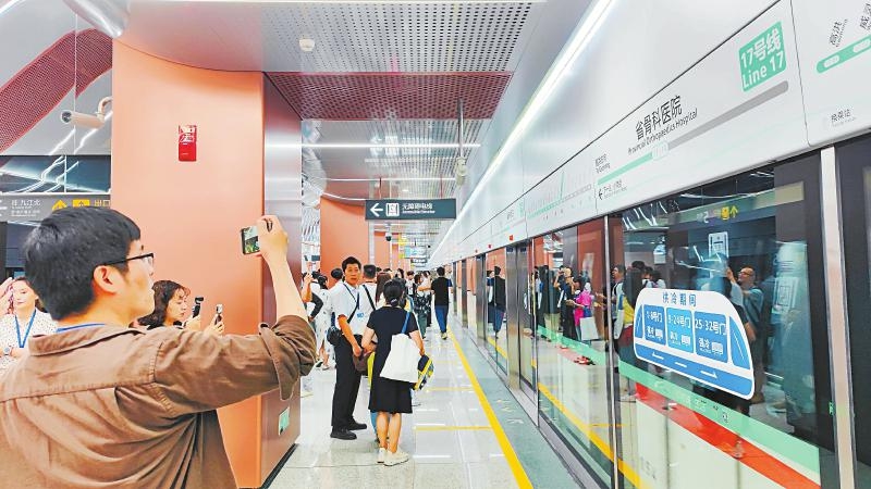 试乘市民在省骨科医院站拍摄,大家即将登上地铁17号线进行体验。关彤 摄
