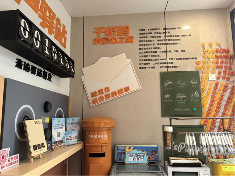 进门区域,为充分考虑便民服务的及时性、便利性,放置了共享充电宝、微波炉、便民雨伞、报刊杂志等,同时展示了驿站推出的公益行动——“千纸鹤”爱心行动计划,以千纸鹤为媒介,针对特殊困难人群推出免费暖心套餐,搭建起开展爱心援助、公益捐赠、传递友善的渠道和平台。在此区域还设置了打卡互动装置,让更多年轻人参与进来,扫码了解“半部电台”背后的通信历史和传奇故事。每一位走进驿站的市民、游客、外卖骑手、快递员、环卫工人都可以在邮筒中投递意见、信件和卡片,与工作人员分享暖心故事、感人瞬间,留下自己的“金点子”,共同将新声驿站打造成为有爱心、有温度、有内涵的暖心驿站。