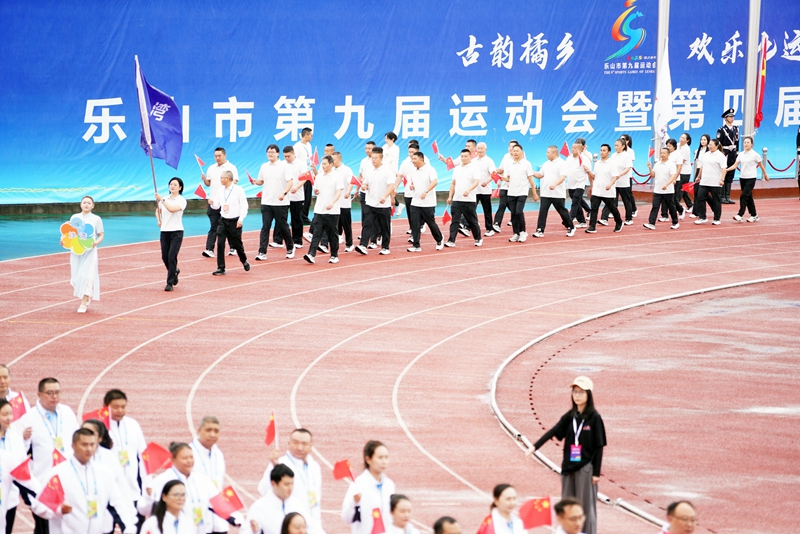 9月22日上午,乐山市第九届运动会暨第四届残疾人运动会在四川省乐山市井研县开幕。9时30分,伴随着《歌唱祖国》的激昂旋律,仪仗队员护拥着鲜艳的五星红旗健步入场,乐山市第九届运动会会旗、第四届残运会会旗紧随其后入场。裁判员、各参赛代表团依次入场。