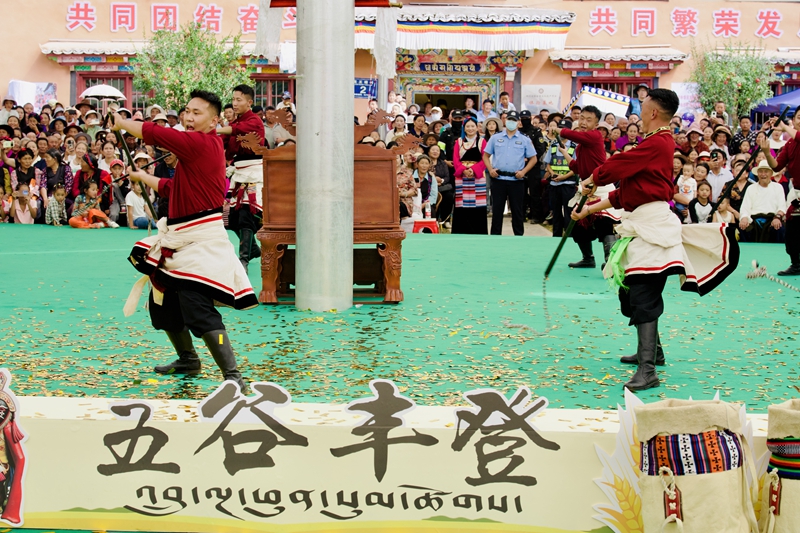 9月22日,四川省甘孜州巴塘县龙王塘群众文化公园内,鼓钹铿锵、长袖飞舞,一年一度的央勒节正在这里热闹举行。