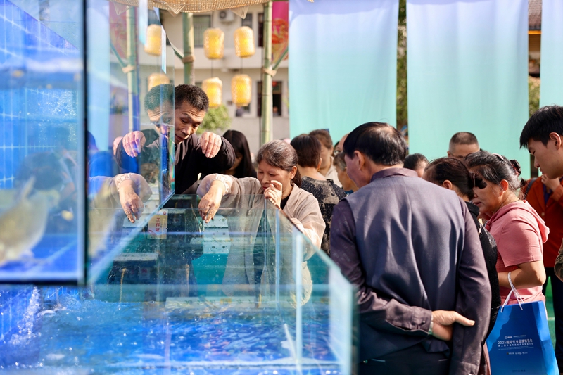在水产美食消费季活动的现场,市民正在参观水产展区。张可凡 摄