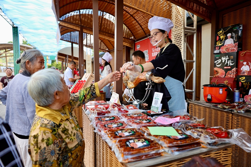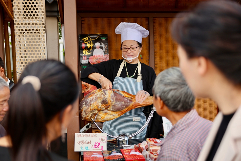 在农产品直播带货美食街,市民正在品尝火腿。张可凡 摄