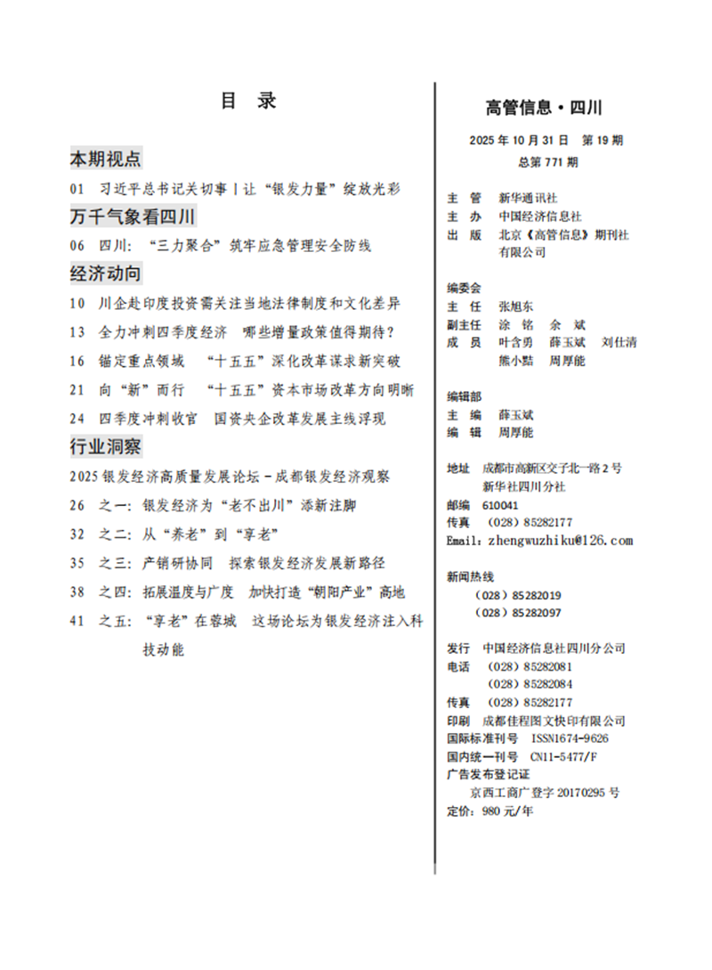 《高管信息·四川》刊物由新华社四川分社着重打造,稿件立足四川在全国发展大局中的战略定位,以做好经济宣传引导为重点,努力为奋力谱写中国式现代化四川新篇章献智献策。