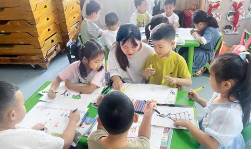指导幼儿绘画。(成都高新区桂溪街道 供图)