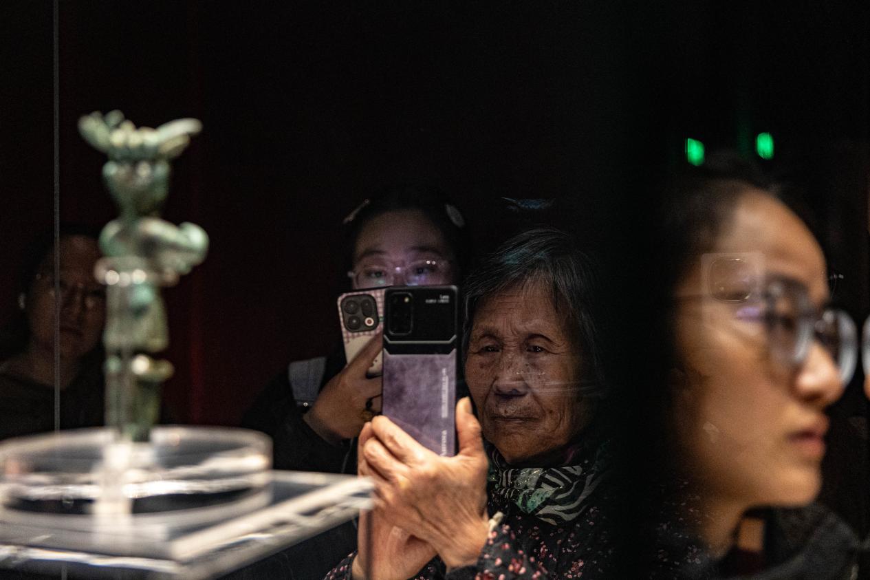 游客在展品“铜立人”前打卡拍照。新华网发(张可凡 摄)