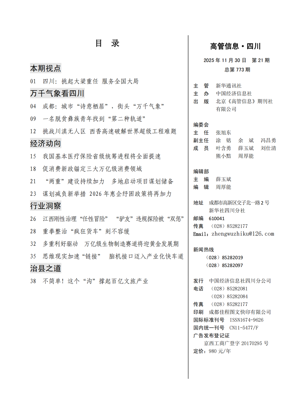 《高管信息·四川》刊物由新华社四川分社着重打造,稿件立足四川在全国发展大局中的战略定位,以做好经济宣传引导为重点,努力为奋力谱写中国式现代化四川新篇章献智献策。