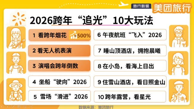 新趋势“跨年追光游”衍生出了很多热门玩法,包括看烟花秀、无人机表演,参加跨年演唱会、乘船或乘飞机迎接新年第一缕晨光、在雪场滑进新年、于山顶或雪山酒店拥抱晨曦、海岛看日出以及篝火露营仰望星光等。