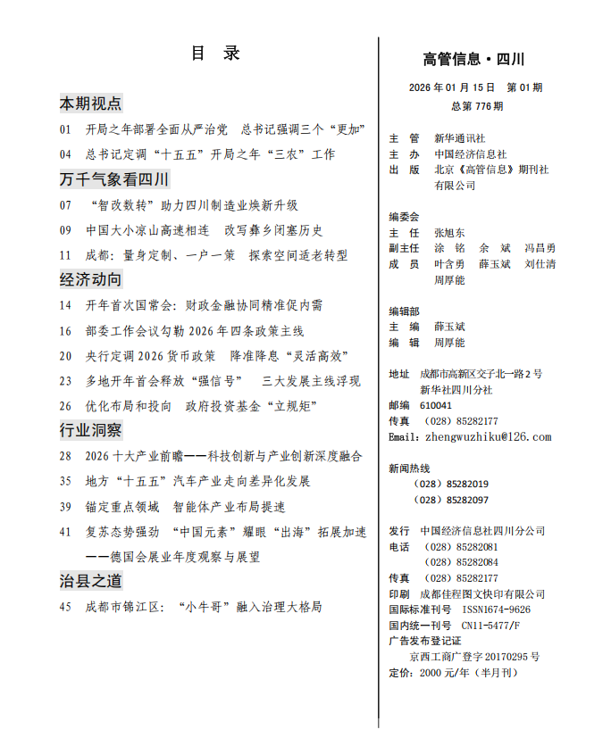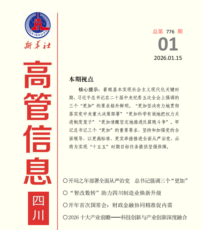 《高管信息·四川》刊物由新华社四川分社着重打造,稿件立足四川在全国发展大局中的战略定位,以做好经济宣传引导为重点,努力为奋力谱写中国式现代化四川新篇章献智献策。