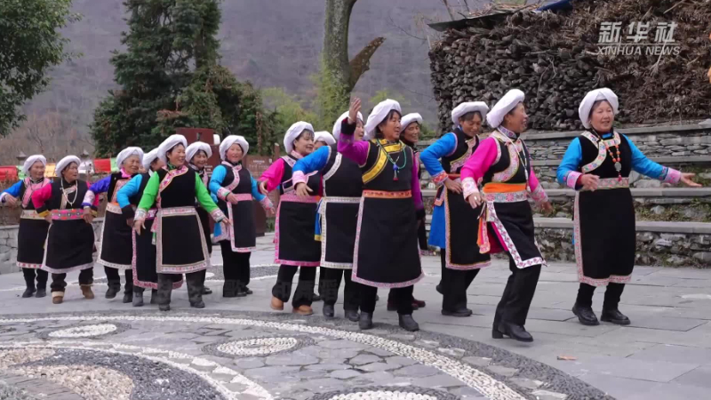 春节期间,迎客歌、民族舞蹈、互动游戏等各种贺新春节目不断在四川省雅安市石棉县蟹螺藏族乡蟹螺堡子上演。